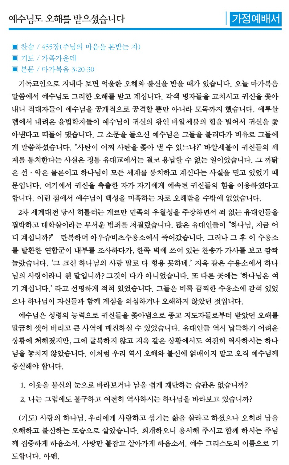 [가정예배서] 2014년 10월 12일 가정예배서 예수님도 오해를 받으셨습니다